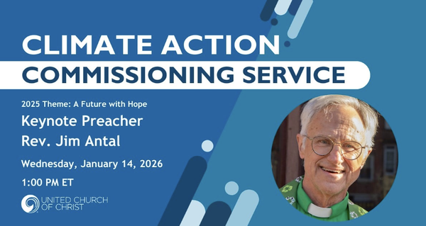 As we enter a year of critical importance in the struggle for climate justice, the UCC is holding a Climate Action Commissioning Service. Gather with us as we faithfully prepare ourselves to take action in the coming year. The theme for this service and for the 2026 Climate Hope Art Contest is "a future with hope" (Jeremiah 29:11). Our preacher will be the Rev. Jim Antal, author of "Climate
