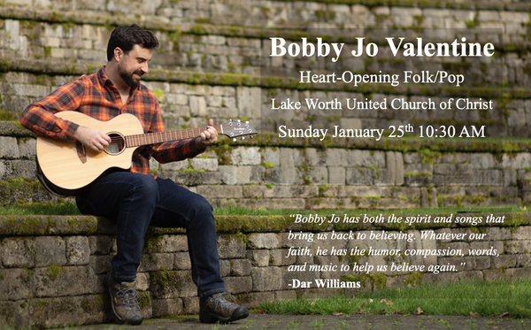 Bobby Jo Valentine will be sharing with us in song and story on Sunday January 25th. Bobby Jo's music exists outside the lines of any genre, but the music’s thoughtful, spirit focused lyrics and catchy melodies reach listeners across all walks of life. The poetic nature and spiritual focus of his stories and songs has resulted in notable awards and a growing, loyal following around the country.