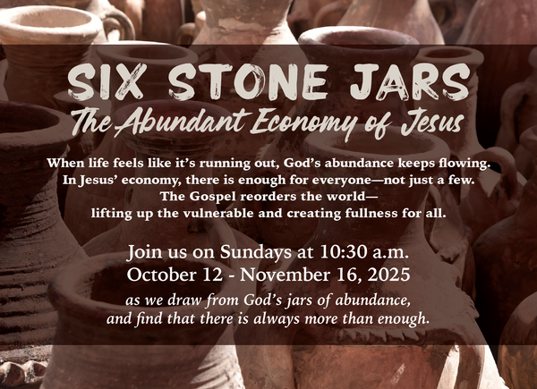 On Sunday October 12, we will beging a new worship series that will continue to lead us through the Gospel of Luke, focusing on the abundant economy of Jesus. We'll begin by hanging out with Jesus at the wedding at Cana where a miscalculation has occurred. The wedding guests have drunk all the